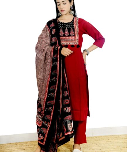Maroon Elegance Cotton Suit Set with Printed Dupatta