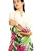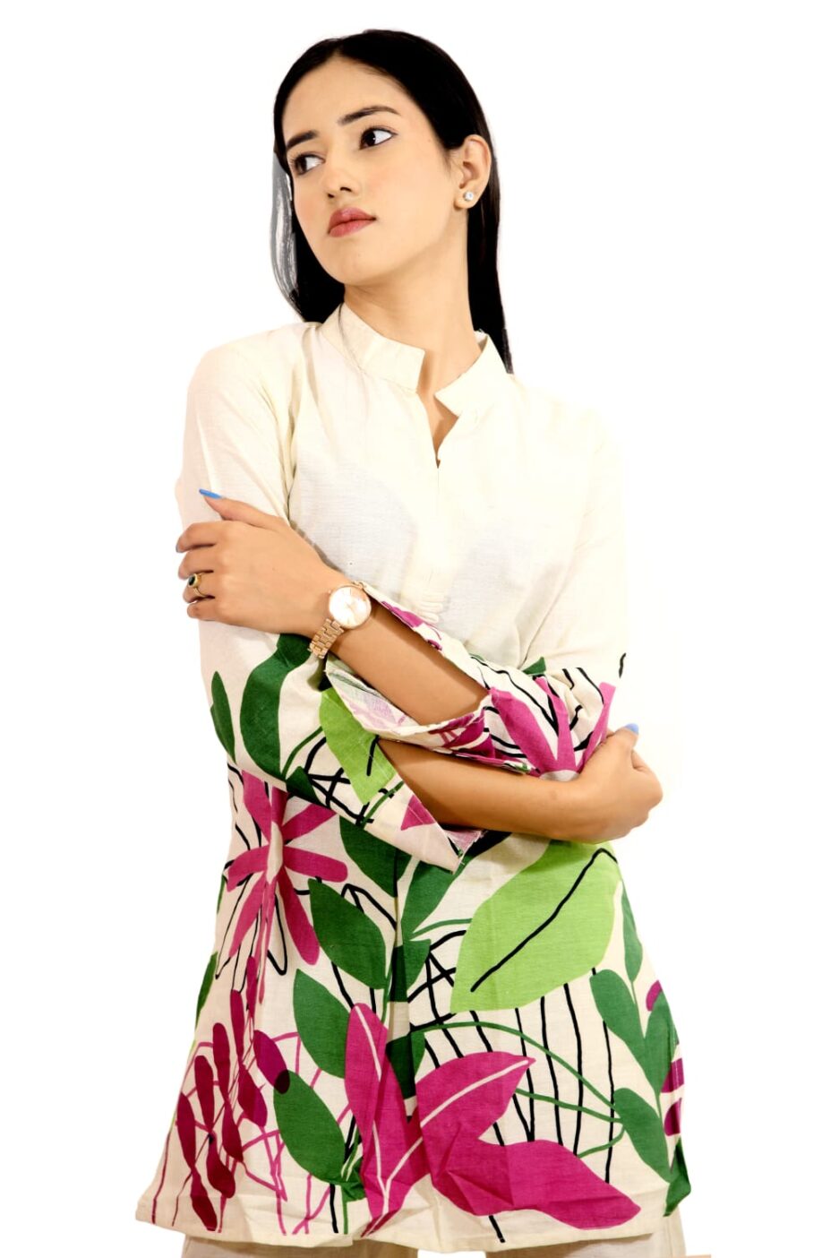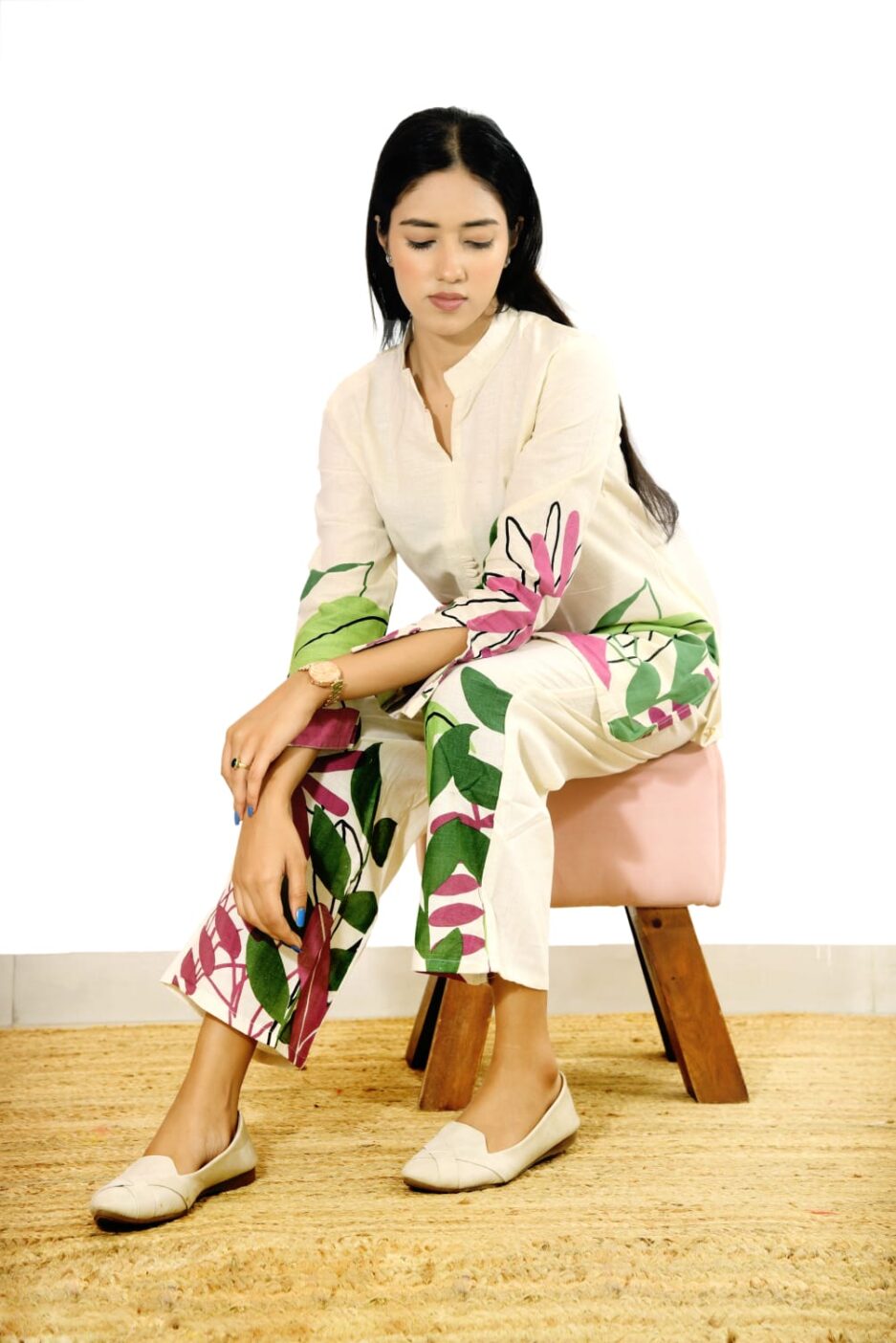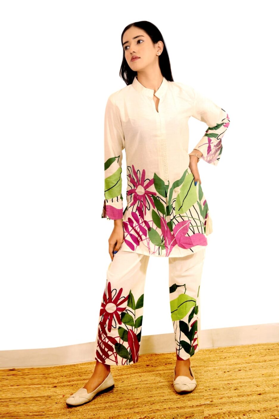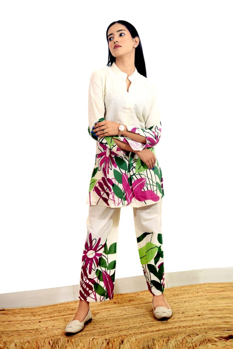 Top: A straight-fit kurta in off-white with a mandarin collar and front slit neckline. The highlight lies in its striking floral print in shades of magenta, green, and purple that flows from the sleeves to the hem, giving it a playful yet sophisticated vibe.