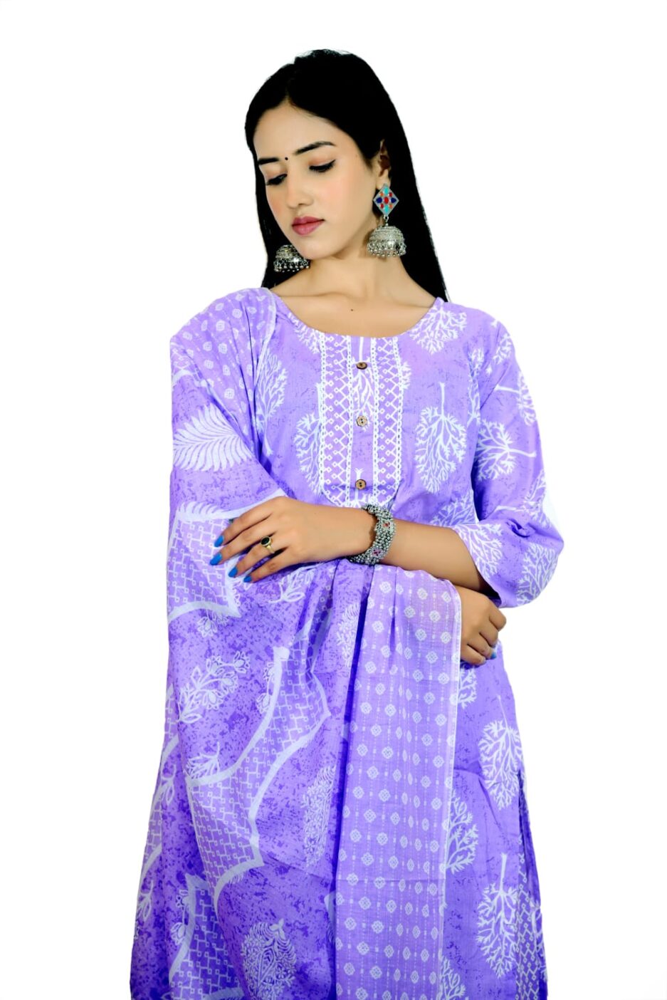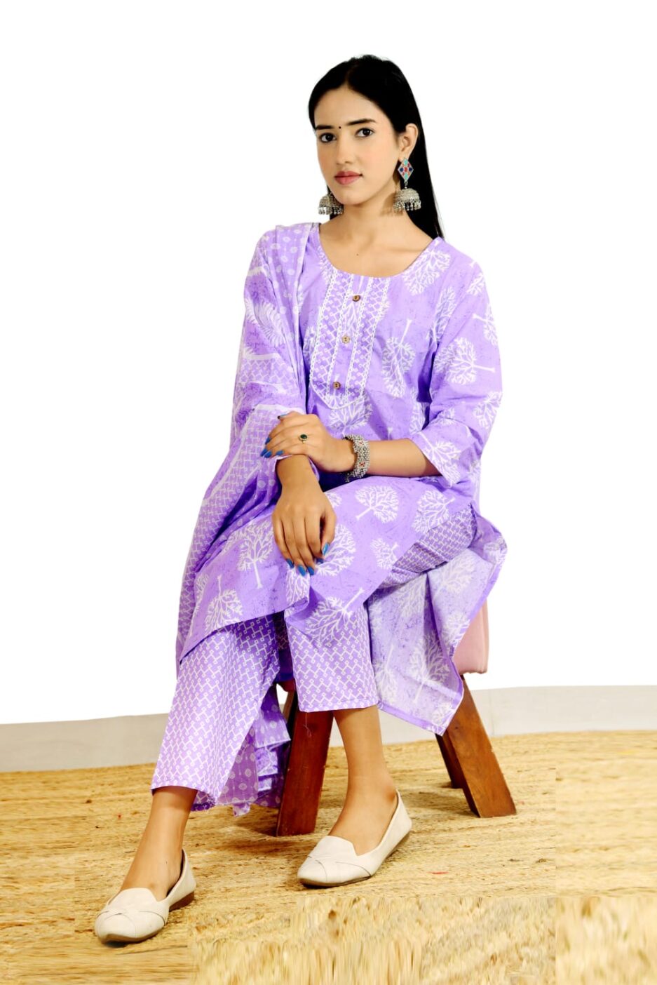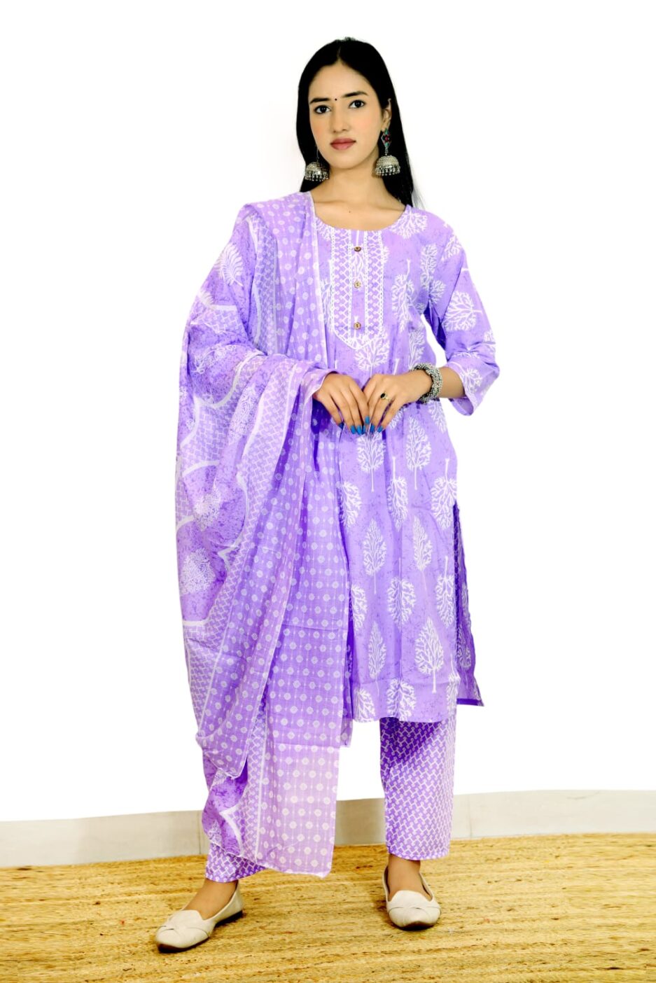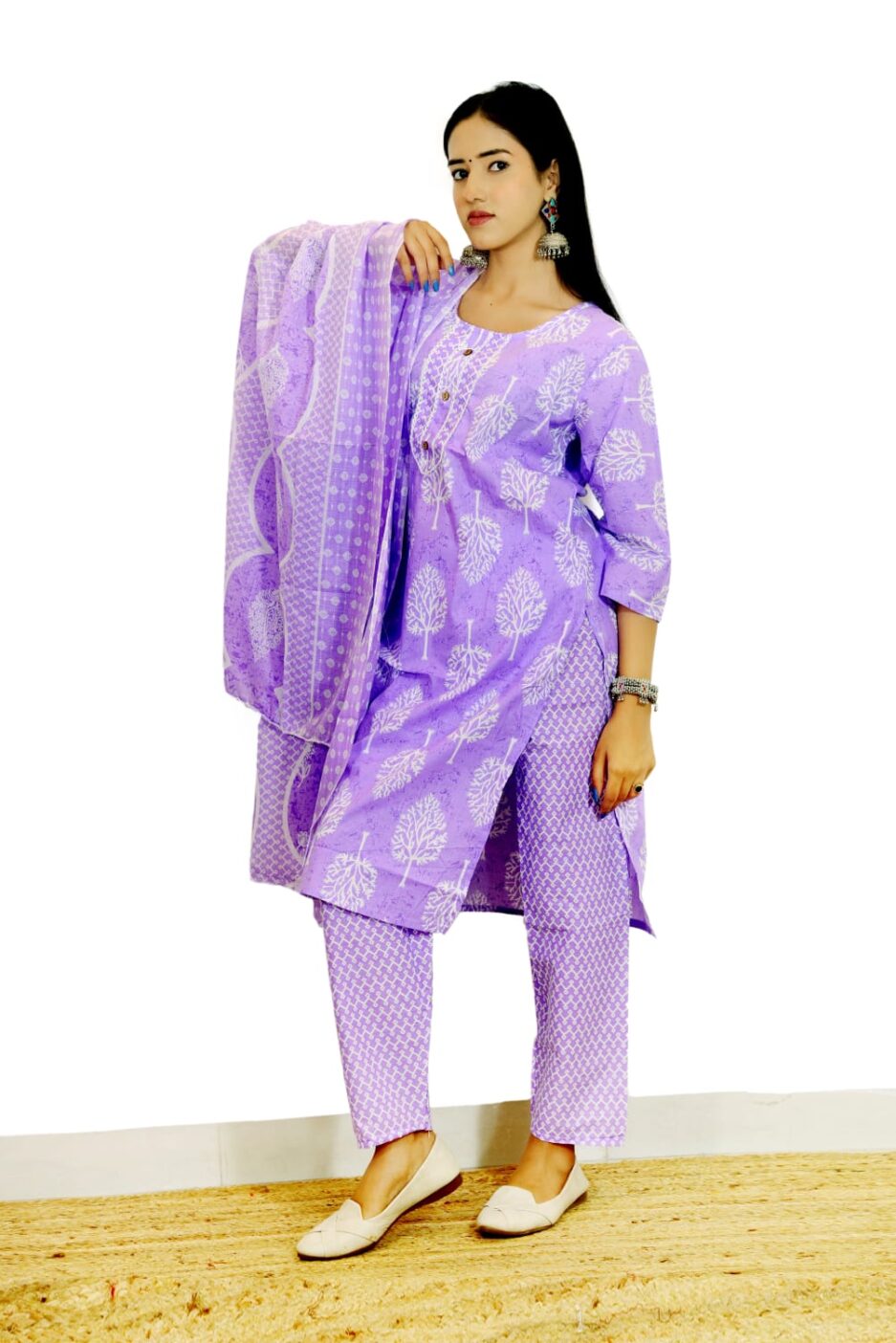 Elevate your ethnic wardrobe with this graceful Lilac Handblock Cotton Suit Set, designed for elegance and everyday comfort.
