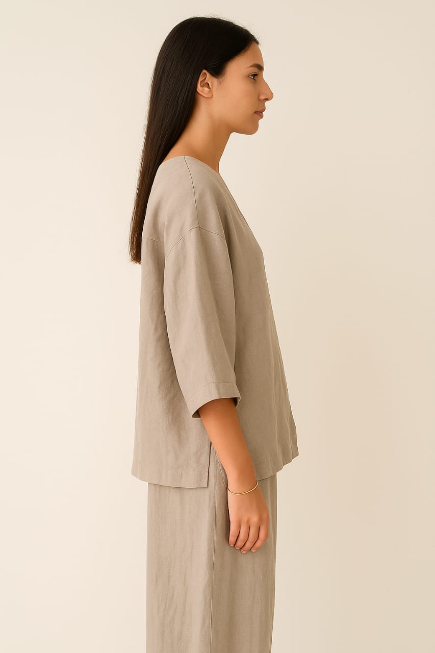 A breezy beige linen co-ord set featuring a relaxed V-neck top with wide sleeves and matching high-waist wide-leg pants — perfect for effortless everyday style.