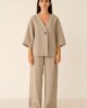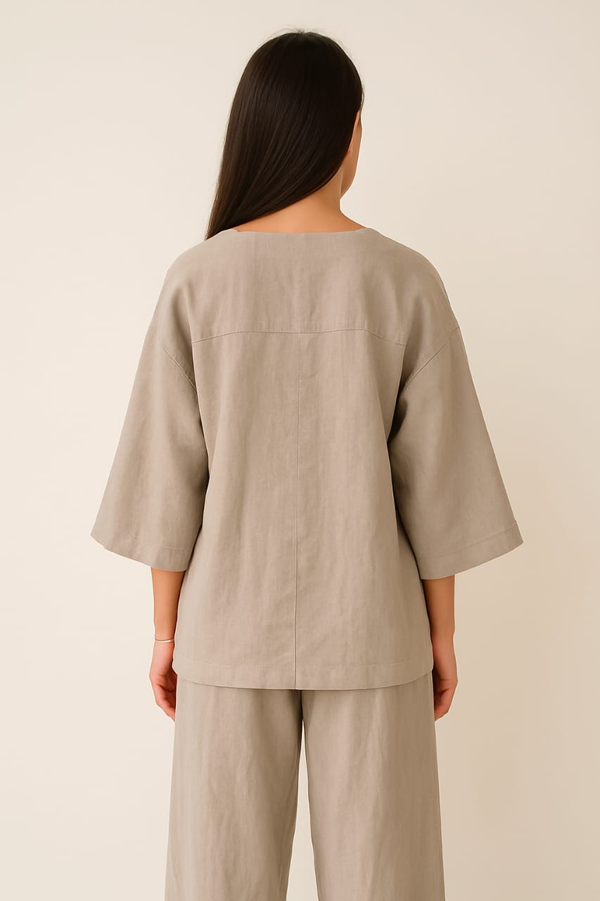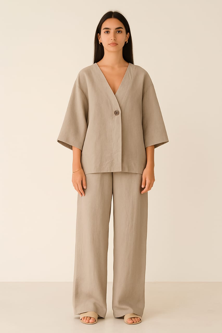 Effortless elegance meets comfort in this minimalist beige linen co-ord set. Featuring a relaxed-fit V-neck top with wide sleeves and a single-button closure, paired with high-waisted, wide-leg trousers for a breezy, breathable silhouette. Perfect for work-from-home days, travel, or slow weekends, this neutral-toned set is a timeless wardrobe staple that blends simplicity with sophistication.
